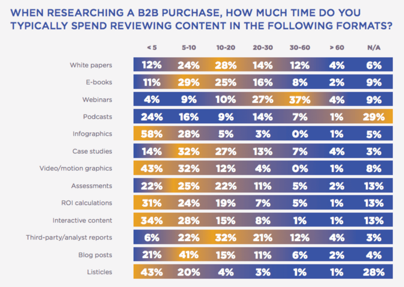 Considering which content types are most popular, we can see that most types of content are useful to someone! This suggests the importance of using content mapping as a technique to align the right types of content with the right persona and stage of the buying process as covered in the templates and examples in our persona guide and template.