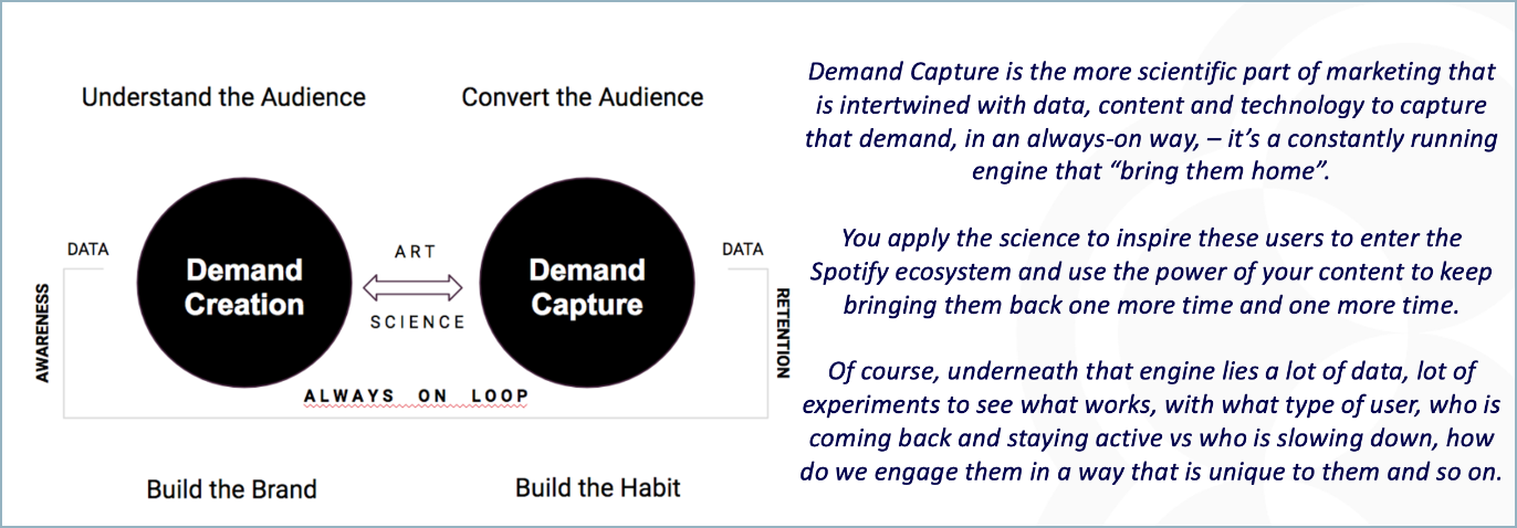 This distinction is important, since our research shows that many businesses under-invest in Always-on activities needed to assess and tap into the continuous demand as people search for products and services they're interested in. This visual shows an example shared on LinkedIn from Spotify's former Always-on Marketing Director recommending their vision for tapping into this always-on demand.
