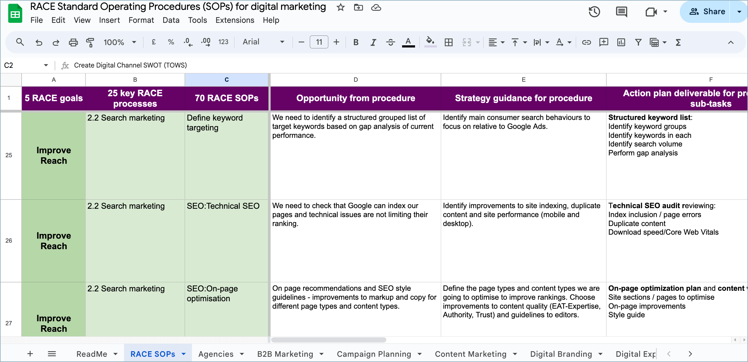 Our RACE framework spreadsheet features SOPs from across marketing including strategy and implementation and also links to other spreadsheet templates that can be used to build and develop your own SOPs. Let's take a look at a full example of a single SOP.