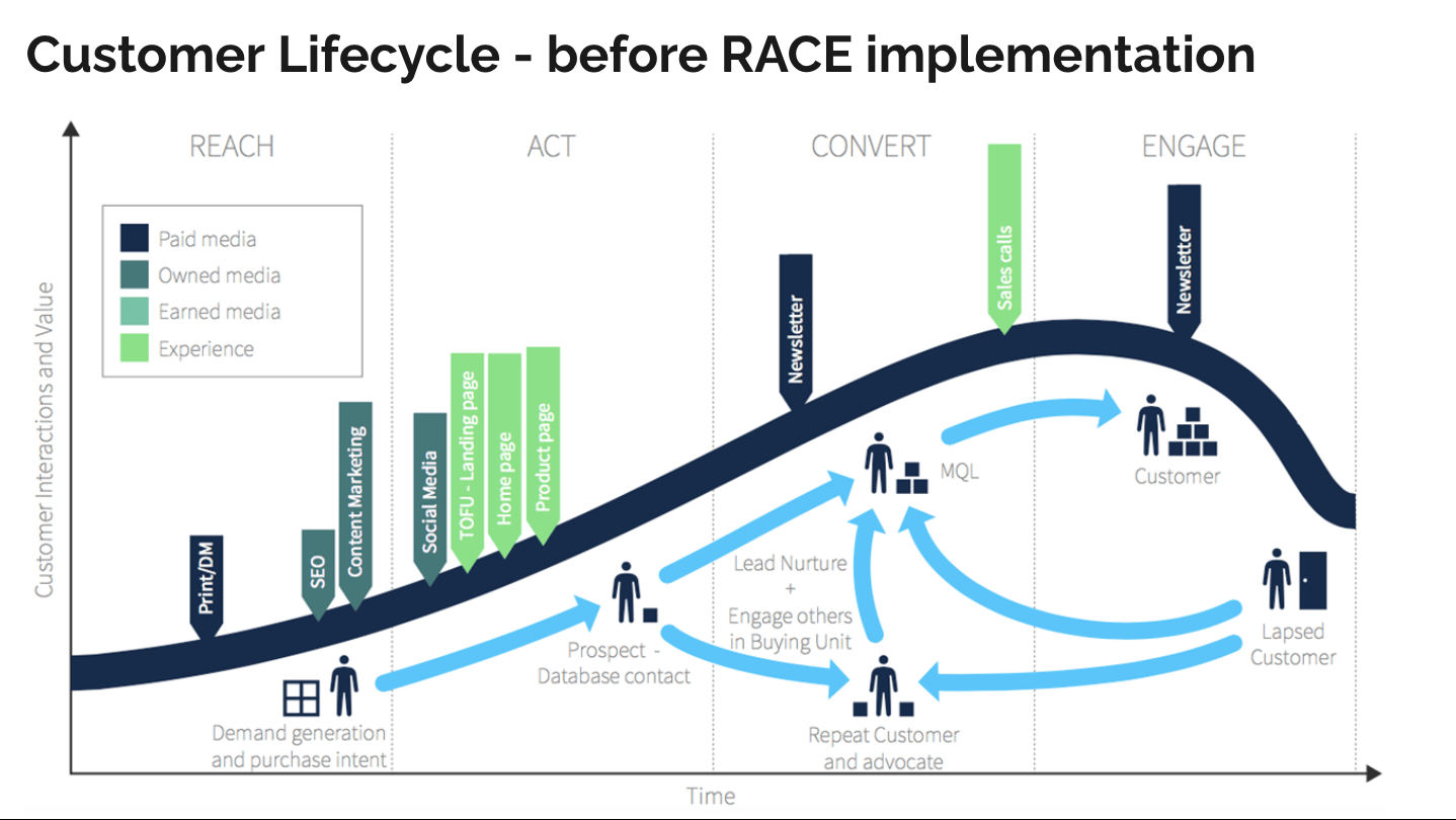 Case in point, here is an example of a typical customer lifecycle for a marketer's business before implementing RACE analysis. This reflects the kind of activities that we see running as 'always on' marketing for small businesses before they implement RACE. They have often grown 'organically', based on uninformed opinions of 'what marketing should we do?'.