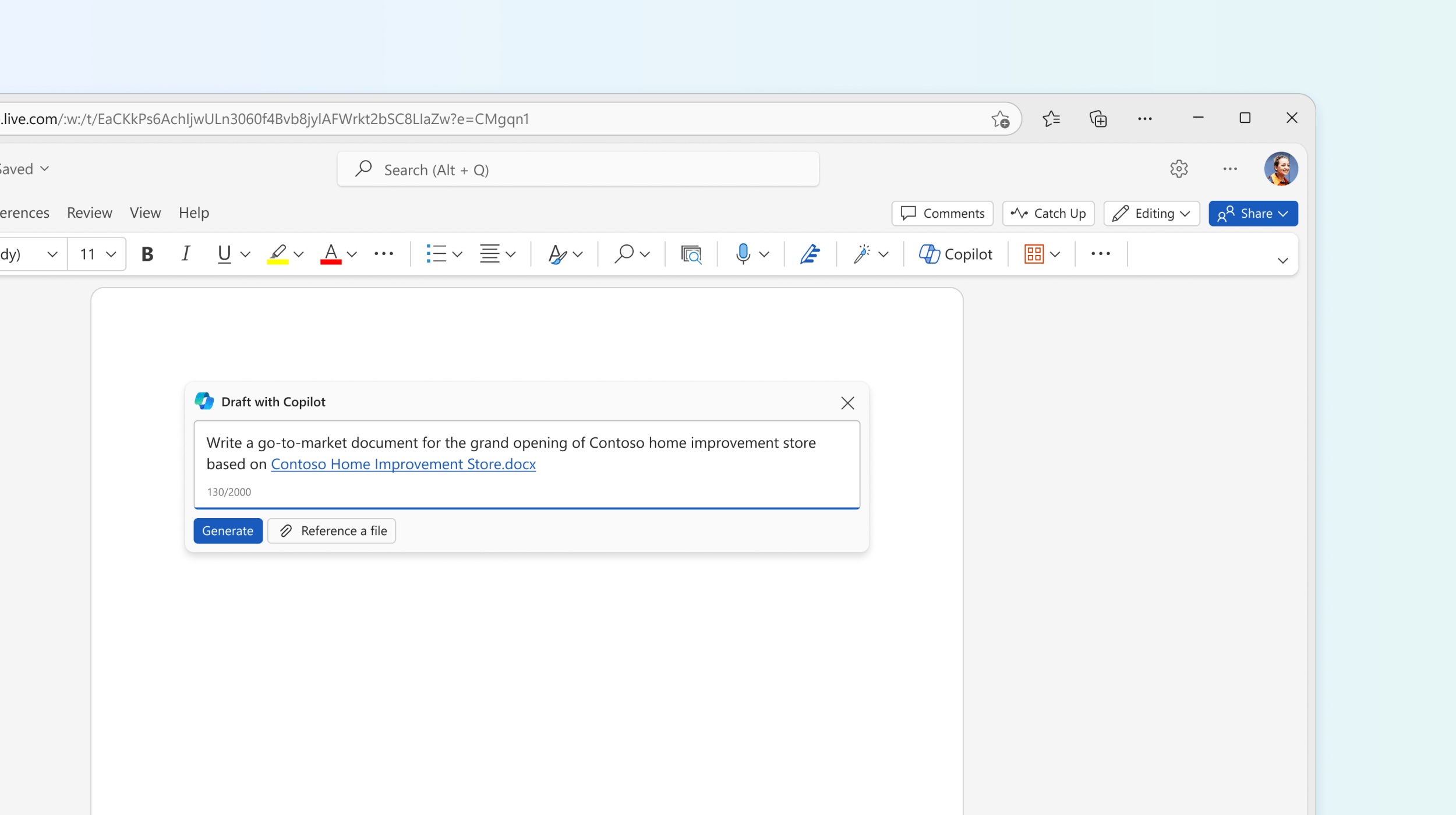 GPTs can be used on the paid Plus plan to tailor further to the market sector. It can also be used via Microsoft Bing, where since November 2023 it has also been known under the Microsoft AI label for productivity tools as 'Co-pilot' as the example from Word below shows. Text-to-image options are available through DALL-E and text-to-video from Sora.