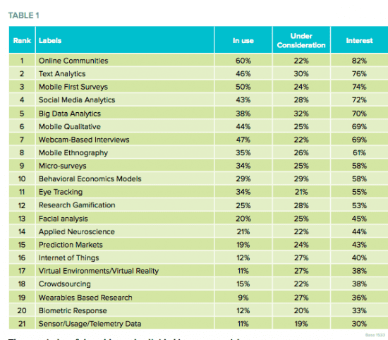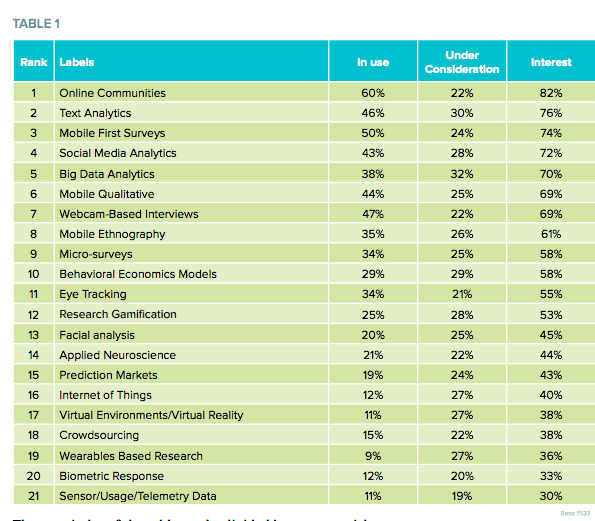 It's great to see mobile first surveys are becoming a major source of data collection, with so many people using mobile phones and tablets, survey experience has in previous years been quite poor. It's great to see that mobile surveys are being optimized so much. Mobile qualitative methods, such as apps asking people to record videos of themselves and do interviews through their phone are also popular methods. Crowdsourcing has taken a hit, with fewer businesses reaching out to participants using crowdsouricng platforms, this is probably because more than ever researchers are trying to accurately target specific audiences.