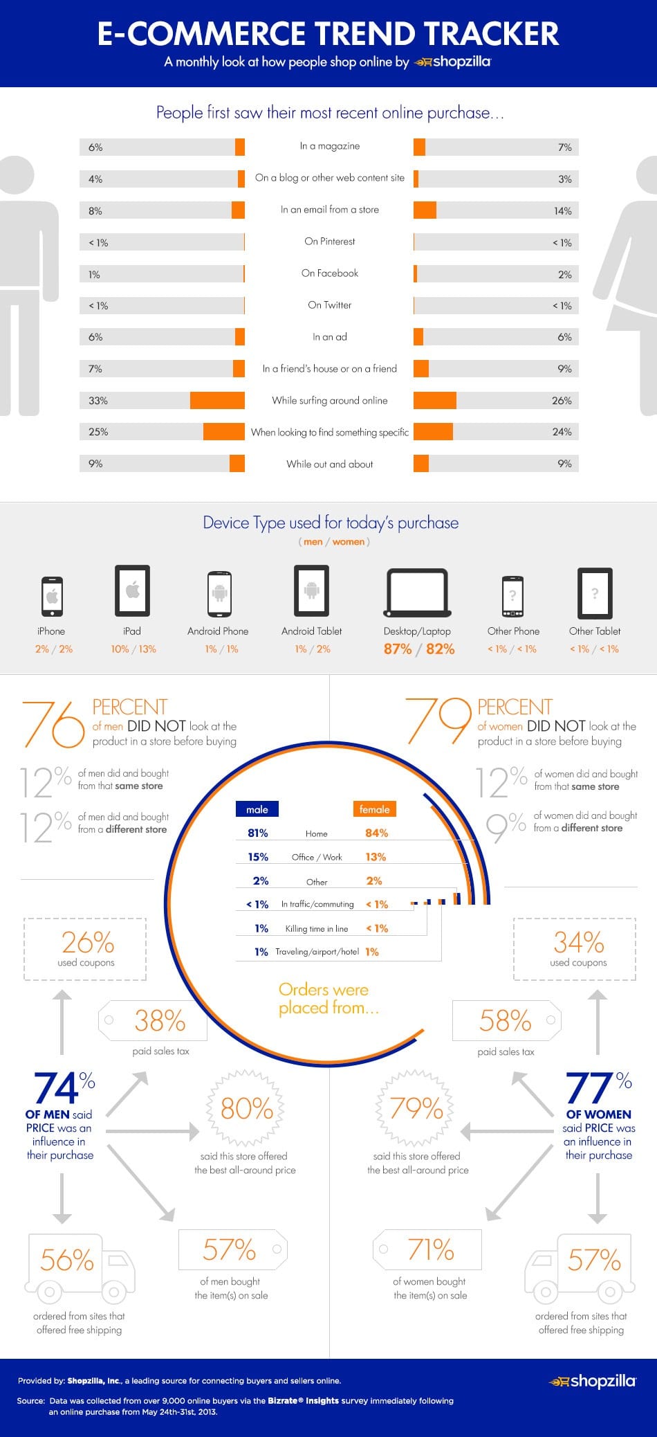 In terms of purchase, Shopzilla's trend tracker shows on average 78% of consumers 'did not look at the product in a store before buying' and females are more inclined to use coupons for savings.