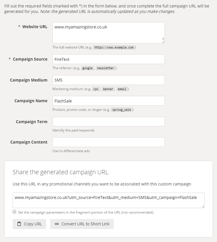 You’ll create your own campaign link with a combination of information like this: www.myamazingstore.co.uk/?utm_source=FireText&utm_medium=SMS&utm_campaign=FlashSale which tells Google Analytics that your visitor has come on to your website via the medium of ‘SMS’ and a campaign named ‘FlashSale’