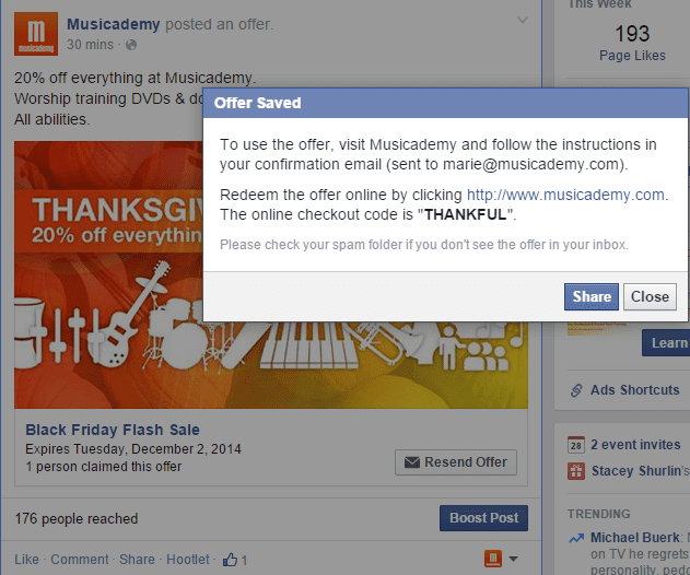 And the other great thing about Offers is that Facebook emails your offer to those who click on it plus sends another reminder email just before the offer expires. What's not to like?