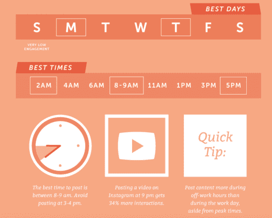 13. The best time to post on Instagram for the most engagement is at 2am or 5pm on Mondays or Thursdays (CoSchedule, 2017)