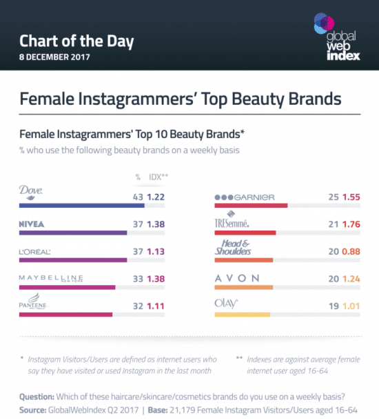 According to Global Web Index compared to the average female internet user, female Instagrammers are about 30% more likely to be interested in beauty products. Over a quarter of these Instagrammers have followed a new brand/company in the last month or visited a brand’s Instagram page.
