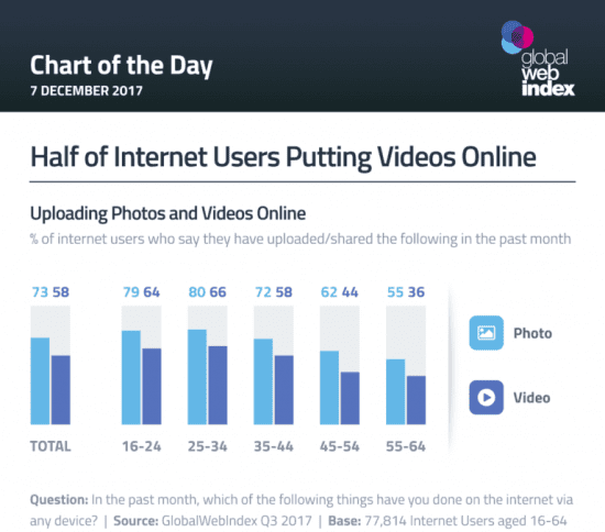 We are consuming more video than ever before. Global Web Index have reported that while nearly 3 in 4 internet users shared a photo last month, the figures for uploading videos are not far away, with almost 6 in 10 having done so.