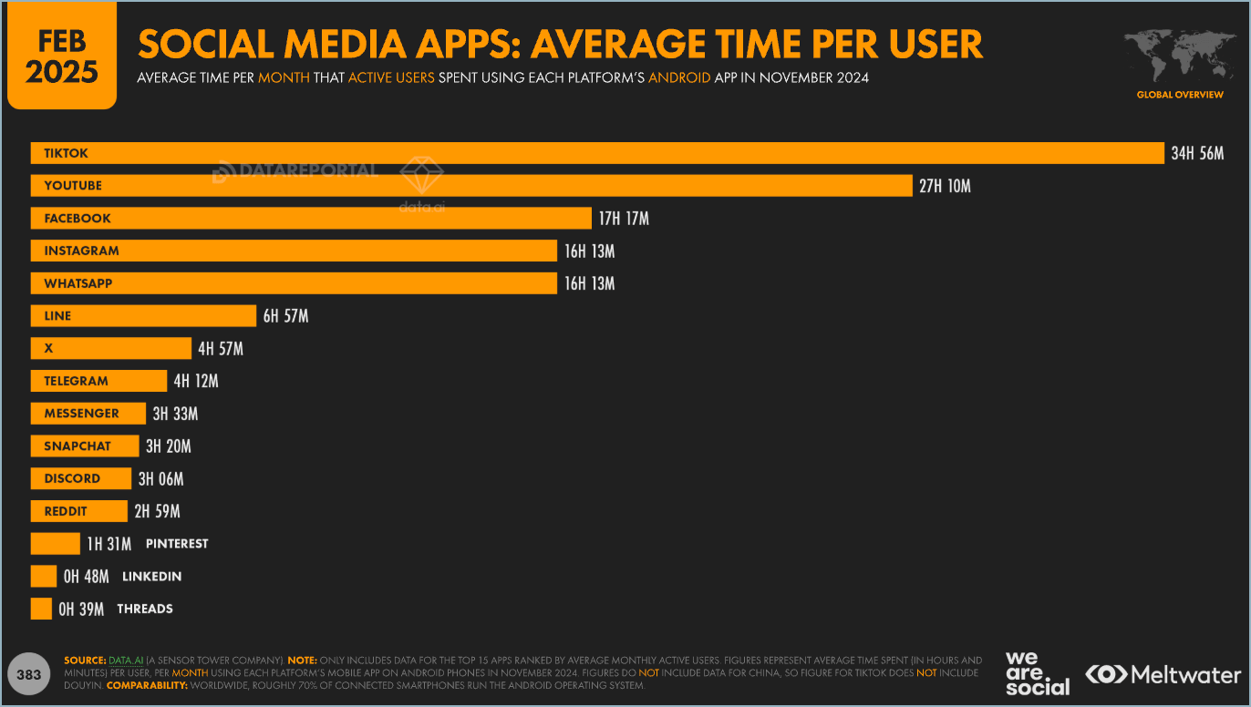 Mobile app usage gives another benchmark for the most popular social networks. Considering average time per user, YouTube and TikTok are most popular overall.