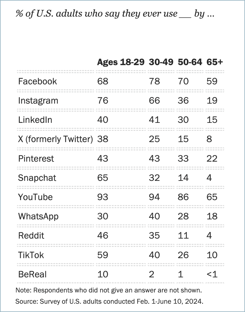 This less recent data from Comscore focused on the UK for Gen Z, Milennial and Gen X groups shows the wide variation in usage of social apps in the UK. In the younger age group Reddit and Discord are surprisingly important, in part because of Gaming. Facebook remains dominant in older age groups.