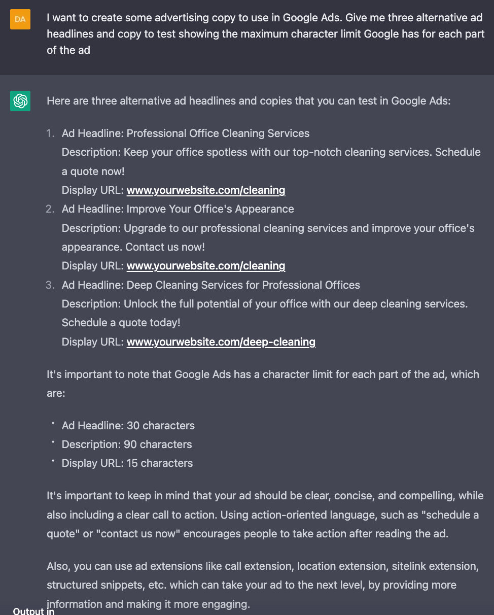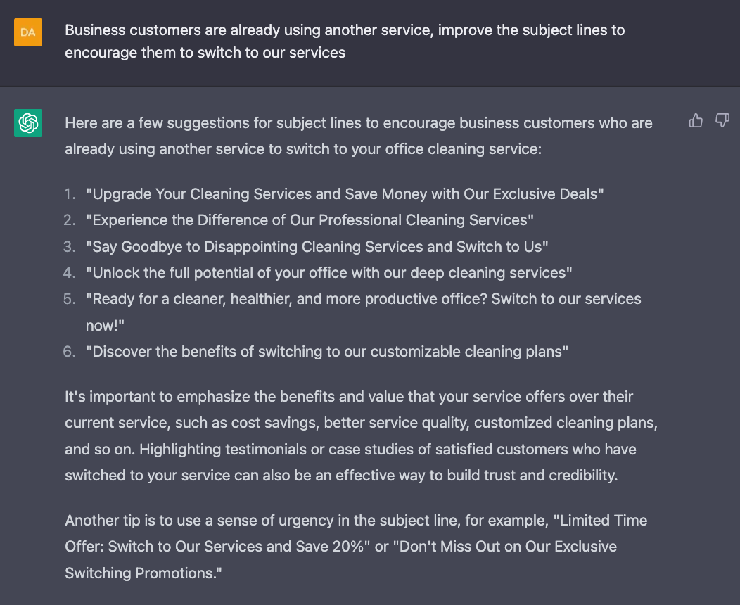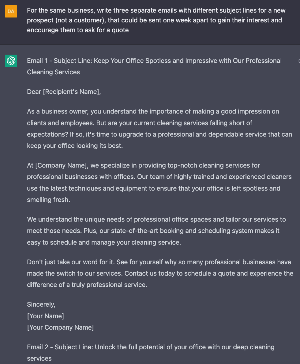 Here, you can see I'm specific in my prompt explaining the context. The product I'm promoting is an office cleaning service.