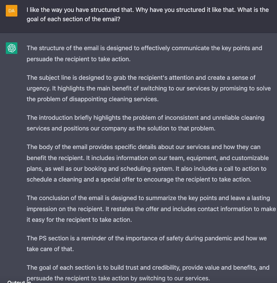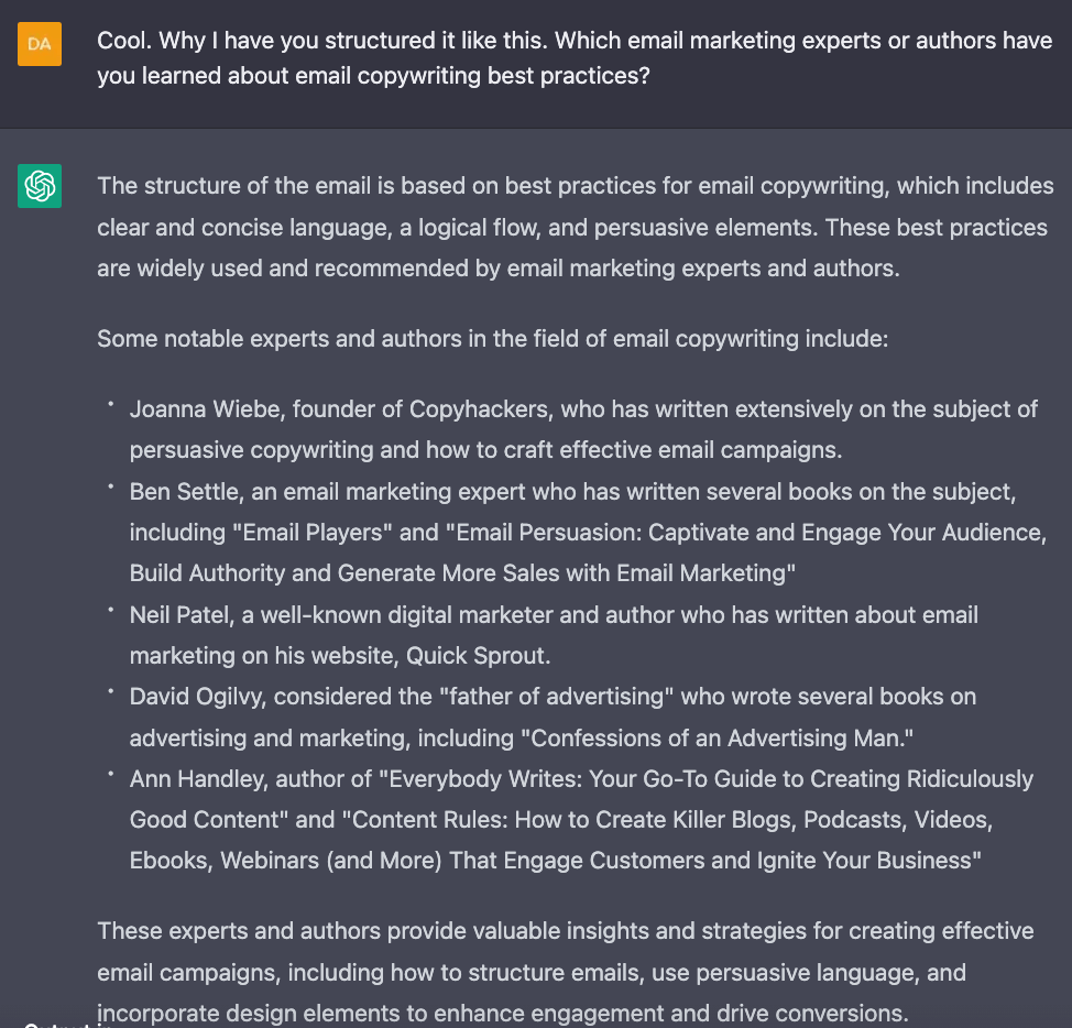 As you use ChatGPT, use it as an opportunity to learn best practices by asking it why it has done things in a particular way and what they are based on. Don't just treat ChatGPT as a black box, ask it why it has chosen particular approaches. Here I ask it why it has structured the email as it has. This is the type of explanation you would get in a book or course on email marketing from an expert. This is great since it can help inform your own copywriting approach.