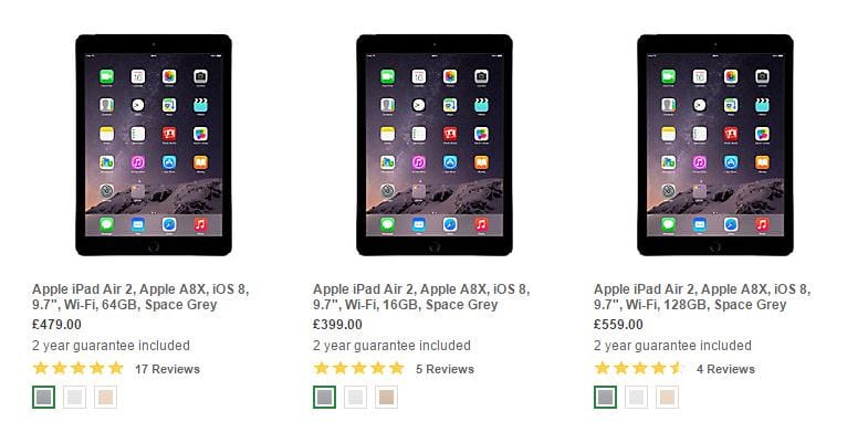 Example B - Apple iPad Air 2 – Prices on Currys.co.uk website = £479