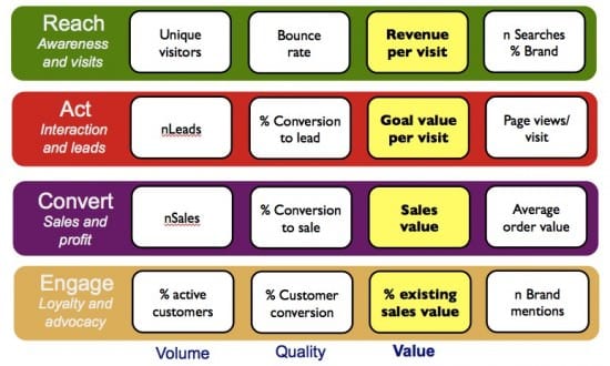 There's the popular marketing mantra - 'you can't manage what you can't measure'. And, in my opinion that's the place to start from when planning to grow the effectiveness of your digital acquisition. The benchmarking process starts with a clear understanding of how you perform across a range of channels, and then understanding the relative efficiencies of different sources for traffic or reach based KPIs and their impact on marketing or sales conversions, including lead generation or email newsletter sign-ups. These are the VQVC metrics Dave describes in this post introducing the RACE KPI framework.
