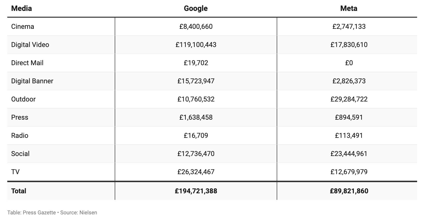 It’s interesting to look at the ad spend of the two biggest digital media spend who spend significant amounts on traditional media as part of a balanced media mix although Google has a large investment in digital video.