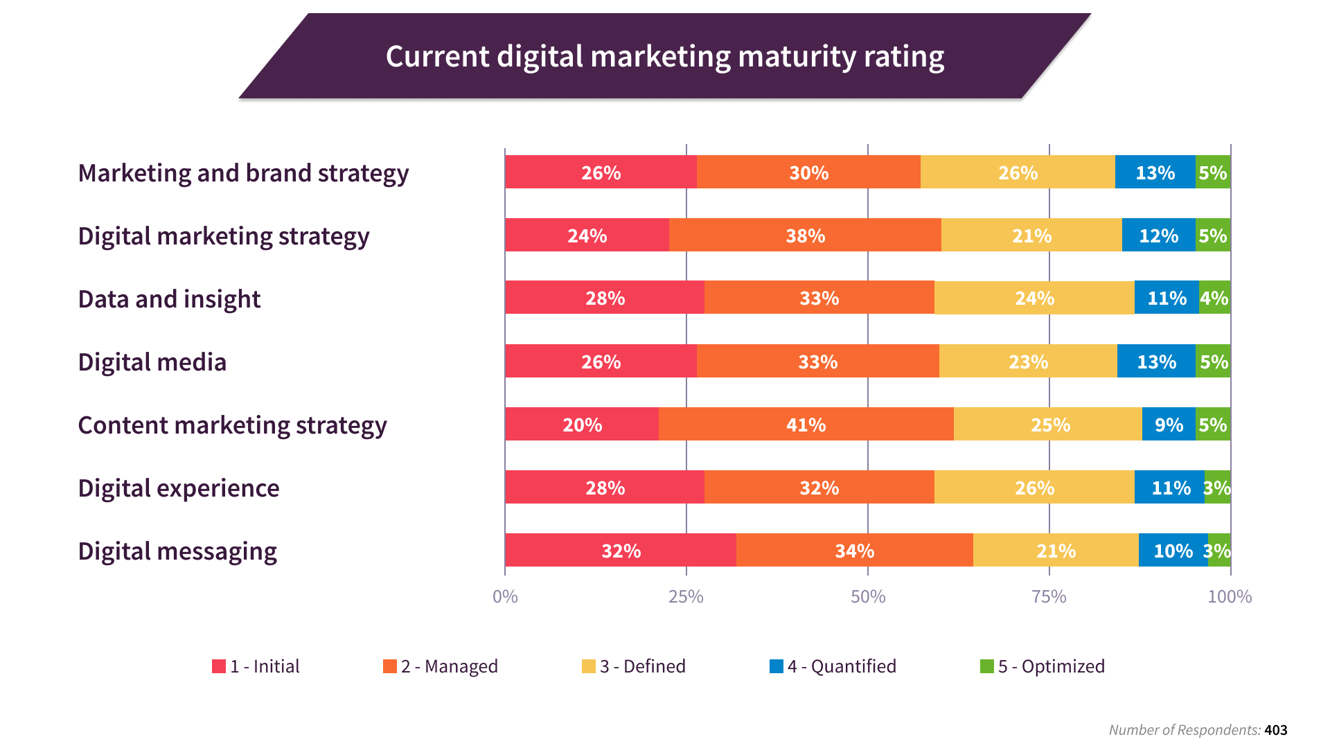 The current maturity of managing websites and/or apps was rated as level 1 or 2 by more than 50% of respondents, suggesting many businesses need to improve in this area. This was reinforced by the assessment of always-on optimization which showed that around half of businesses didn’t perform any website testing.