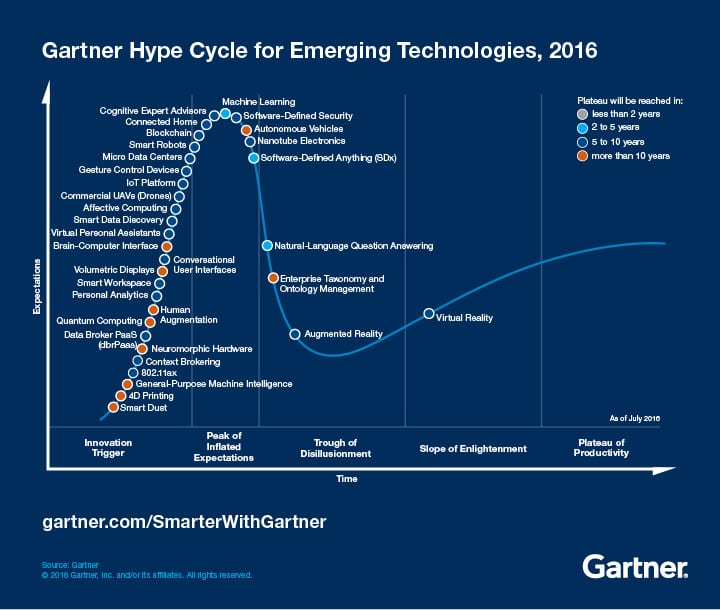 Many of the early deployment 'Innovation Trigger' techniques are less relevant for marketers compared to those related to AI which is now at the 'Peak of Inflated expectations'. One that caught my eye is Conversational User Interfaces. This is a useful application for marketers to consider since it includes using marketing chatbot examples, which we have featured on our blog this year. It also includes voice interactions through the likes of Apple Siri, Microsoft Cortana and Amazon Alexa/Echo.