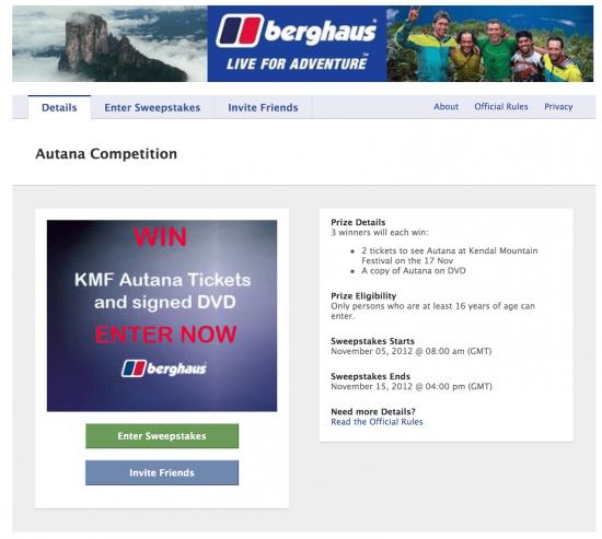 Recently, Berghaus ran a sweepstakes competition on Facebook using Wildfire. The prize, 2 tickets to Autana at Kendal Mountain Festival and a signed DVD. When Facebook users enter the competition, they can also enter details about themselves and have an option to sign up to their newsletter (for more competitions and updates). The prize itself is likely to attract the ‘outdoorsey type’, just the right type of audience for Berghaus to build a list.