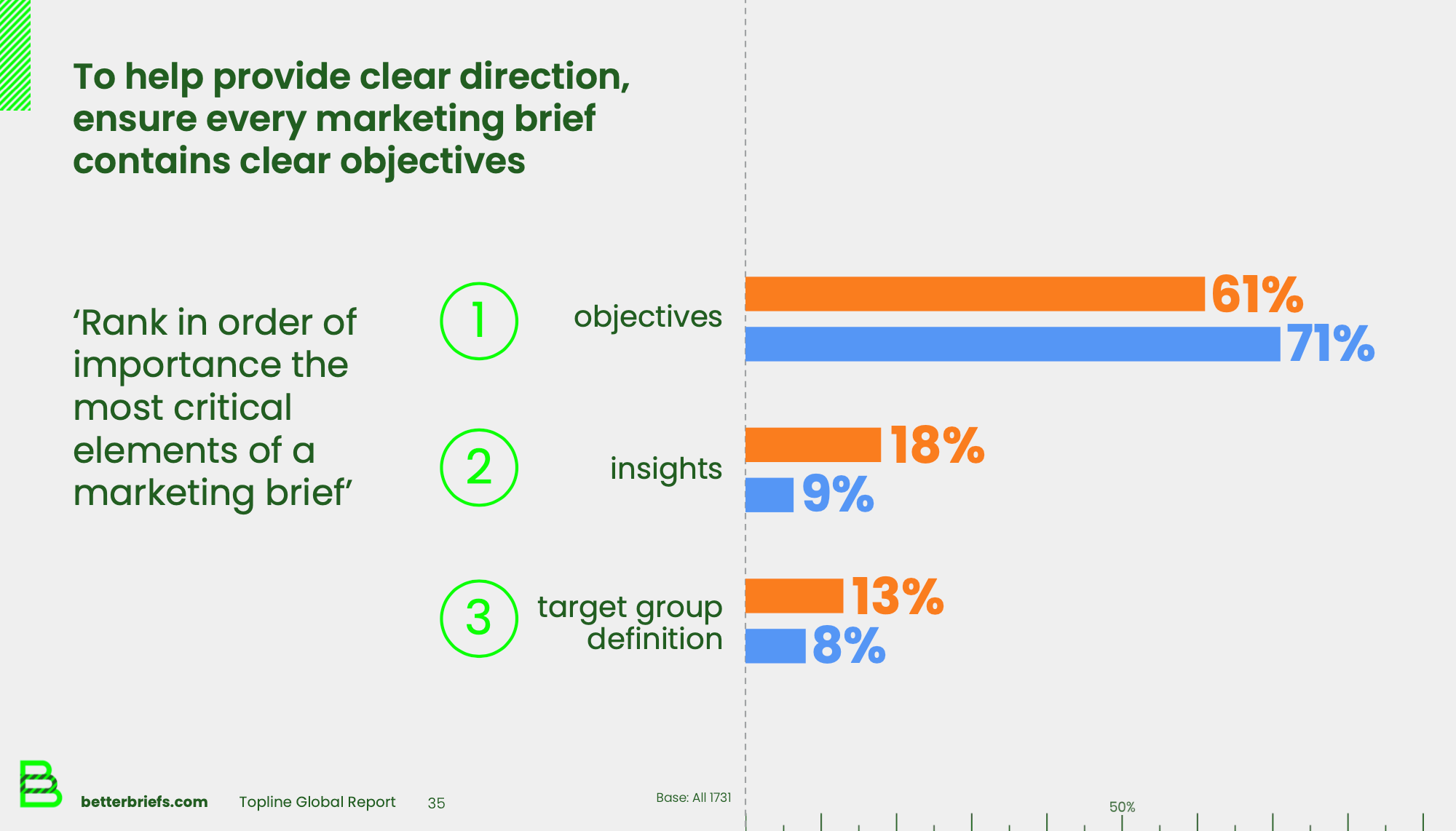 Another useful point for consideration is who should be signing off the brief it was felt by 50% of agencies, that half the time the right people aren't signing off the marketing briefs internally, which seems crazy given the amount of investment which will be signed off to implement the briefs.