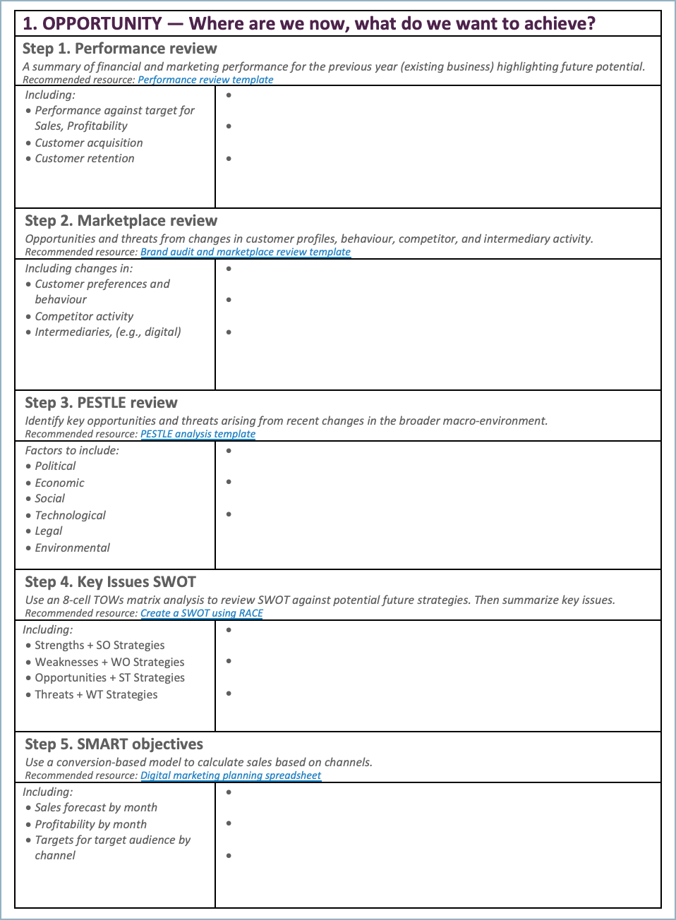 You can download your copy of our free marketing plan template below. Or, keep reading for a summary of the structure across Opportunity, Strategy, and Action.