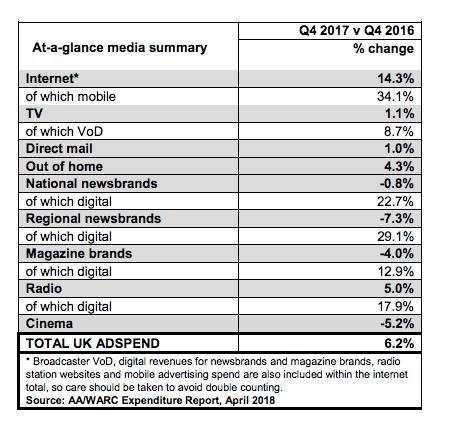 Adspend for 2017 was a record high following 8 years of continued growth in advertising spend. This according to the latest advertising spend figures for the full year 2017 which are analyzed by The Advertising Association and Warc.
